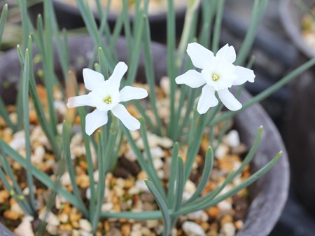 原種スイセンのナルキサス・ワティエリの販売です。モロッコの最高峰ツブカル山の実生球で、波打つ大きな副花冠と真っ白な花がなんとも美しいものです。多湿を嫌い、花付きもあまり良くはありませんが少し増えたので販売してみようと思います。3枚目の写真は販売品の一例です。2.5寸ロングポットに開花見込み〜1作開花見込み球1球入りです。ぜひこの機会にご利用下さい。